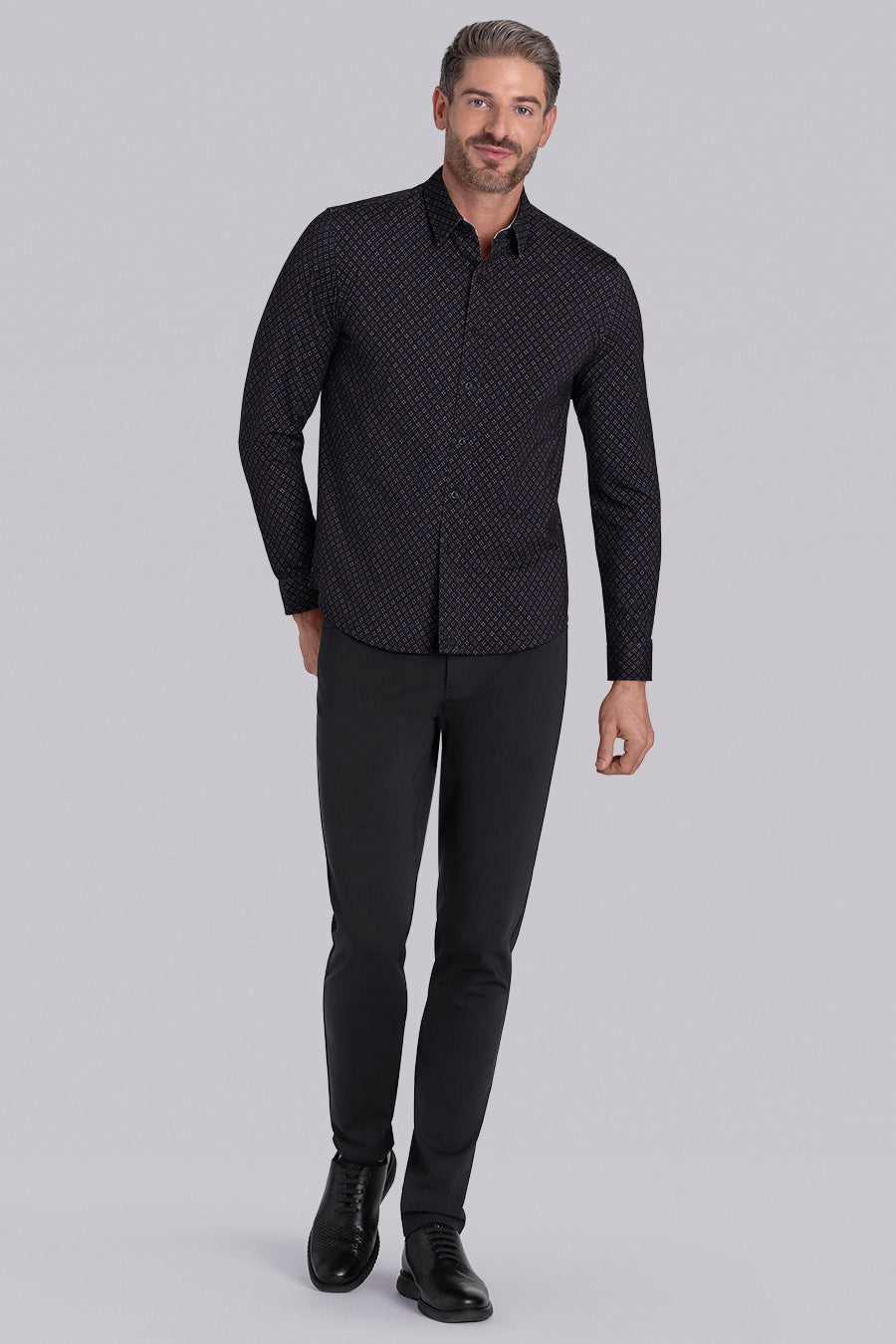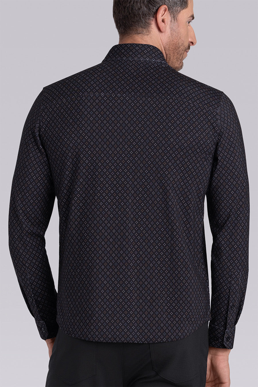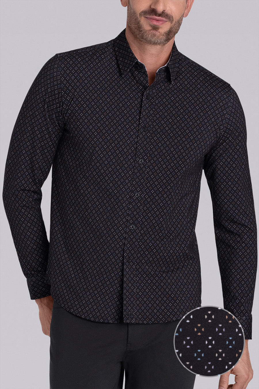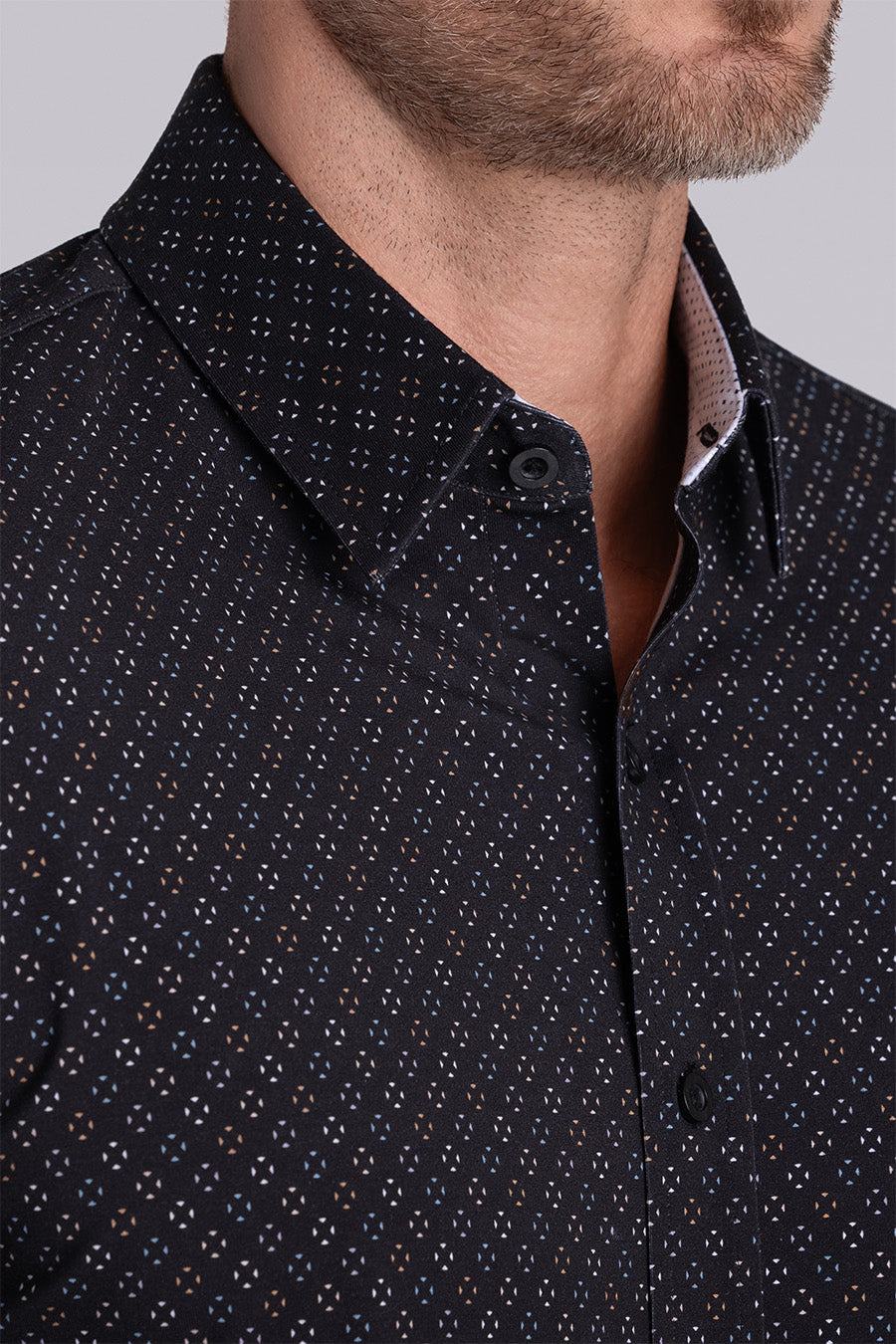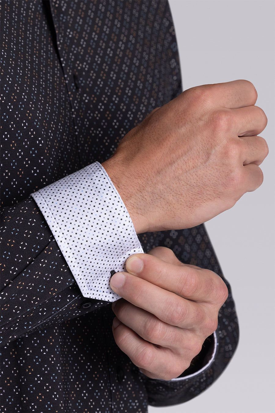 • Contrast print inside the collar stand, and cuff with micro texture print in light grey , and black.