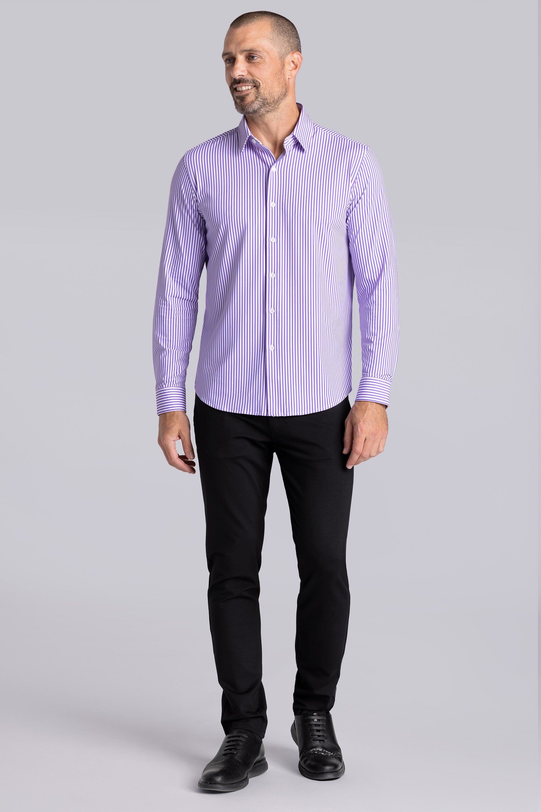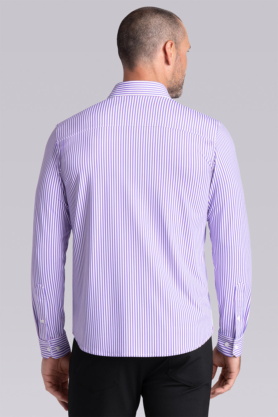 • Contrast print inside the collar stand and cuff with micro geometric print in pruple.
