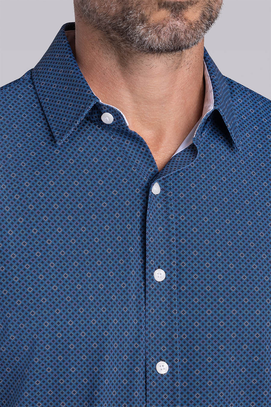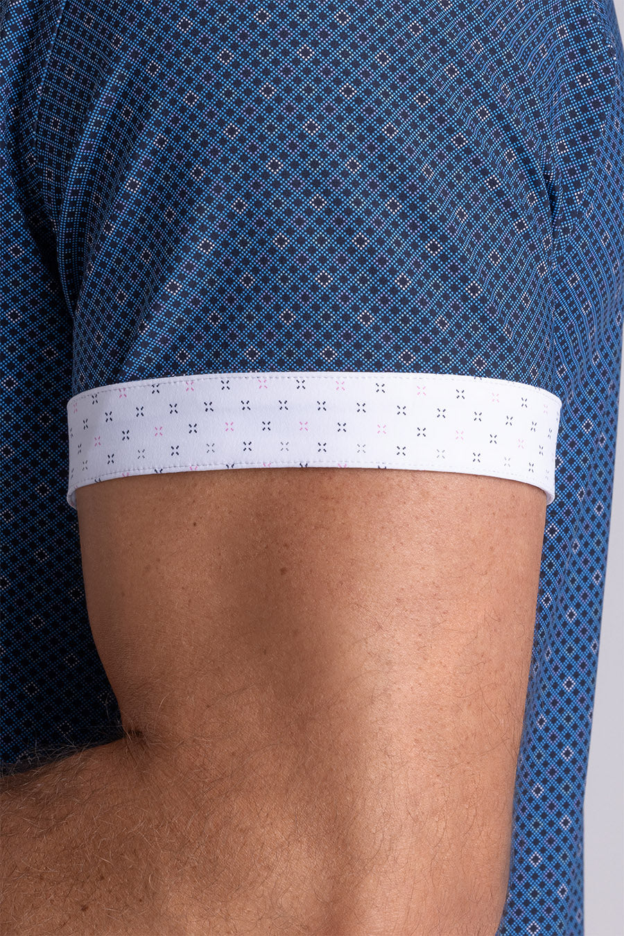 • Contrast print inside the collar stand, and cuff with micro geometic print in Navy / Pink