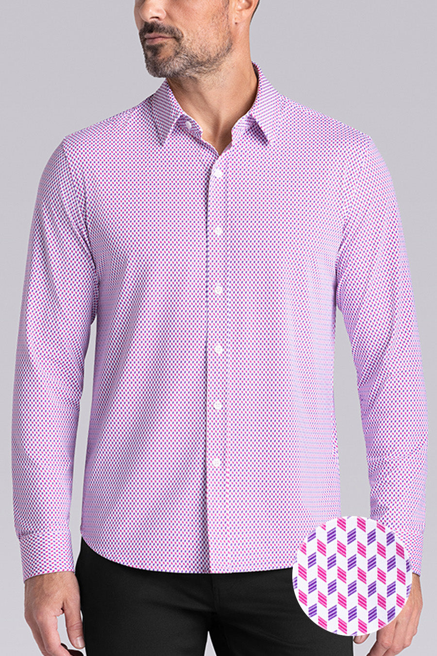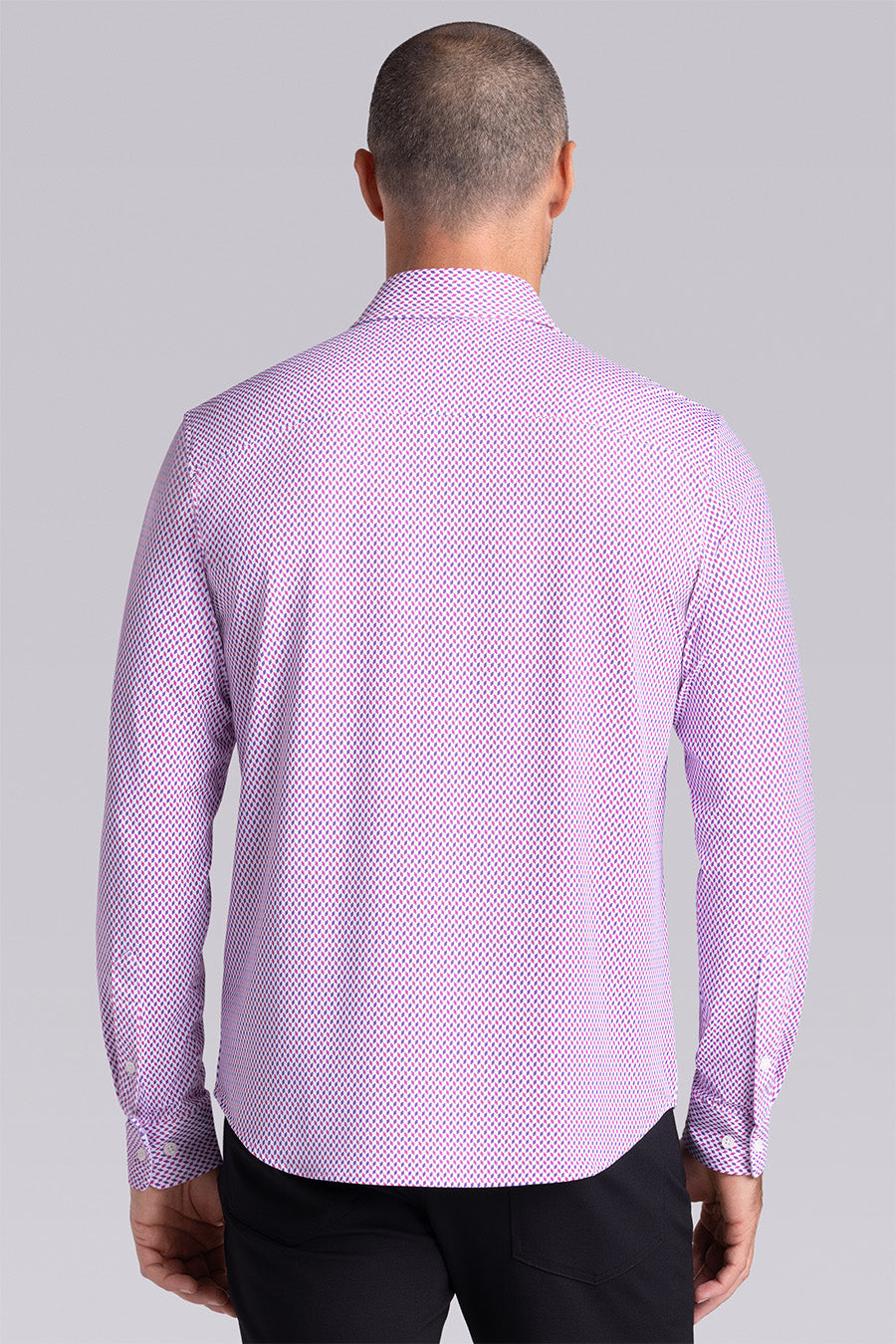 • Contrast print inside the collar stand and cuff with micro geometric print in magenta.