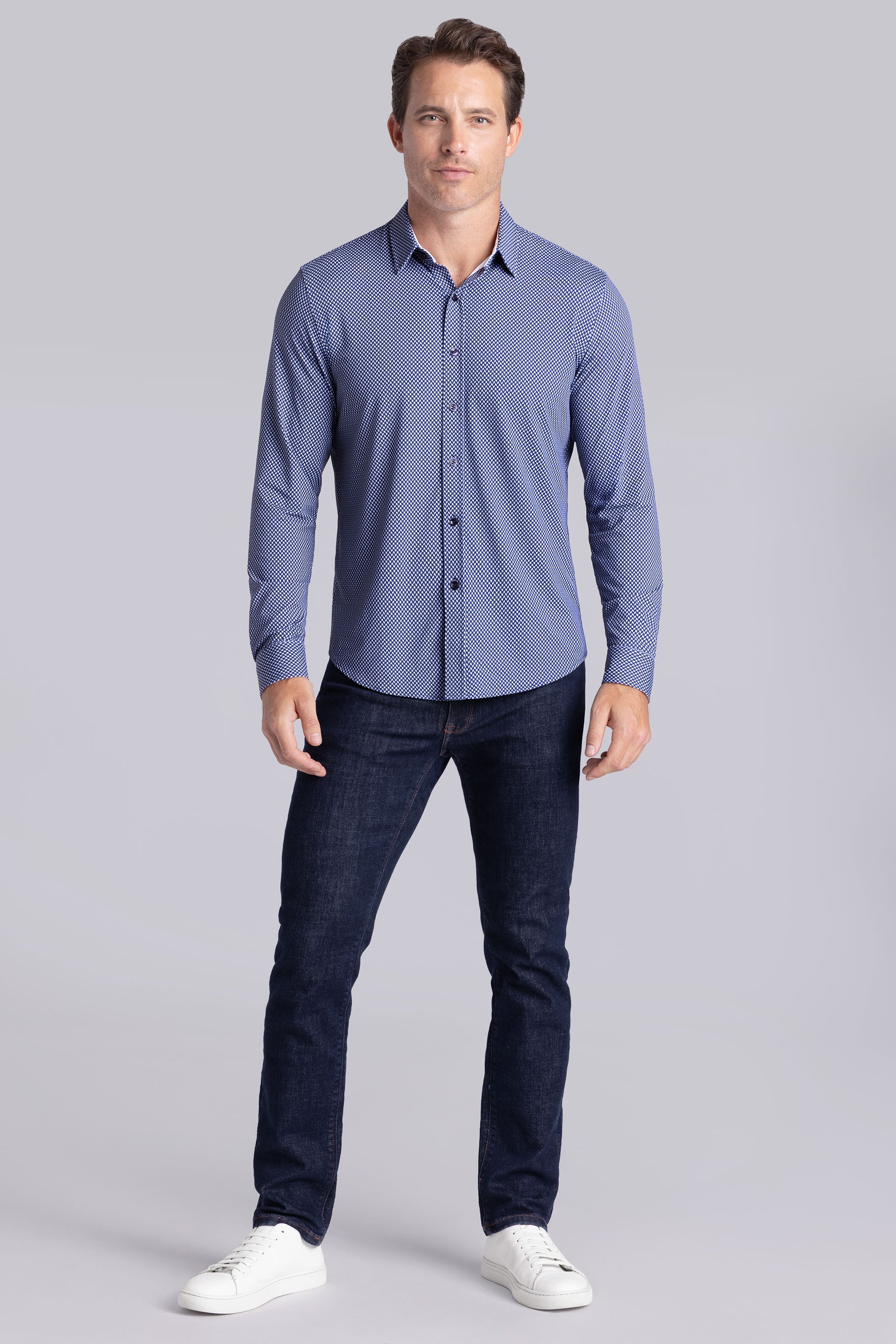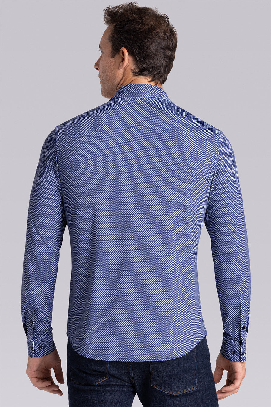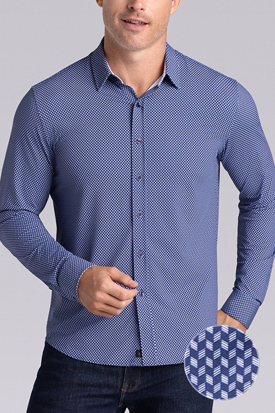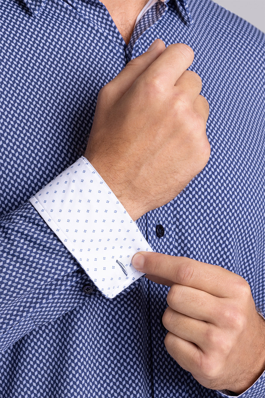 • Contrast print inside the collar stand and cuff with micro geometric print in navy.